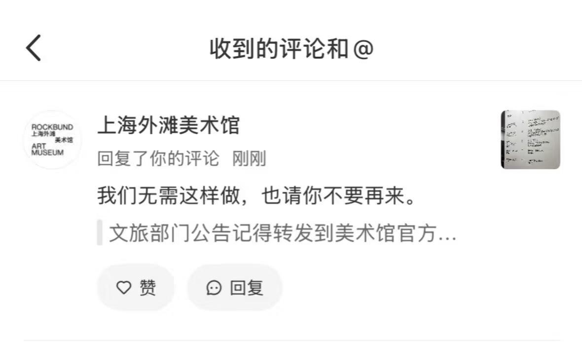 6月17日,该馆小红书账号继发布运营者的公开致歉信后,以美术馆的名义发布了《关于不当言论及入馆模式优化的公告》,向受影响的博主及公众致歉:“相关言论严重偏离了我们始终坚持的尊重、开放、包容的立场和价值观。我们已就此事对账号运营人员进行了严肃的沟通与处理,并将全面加强内容发布的内部管理机制,杜绝类似情况再次发生。”并表示,“上海外滩美术馆欢迎每一位愿意走进艺术的观众。我们正在倾听、在改进,并期待与您共同建设更理想的观展环境。”